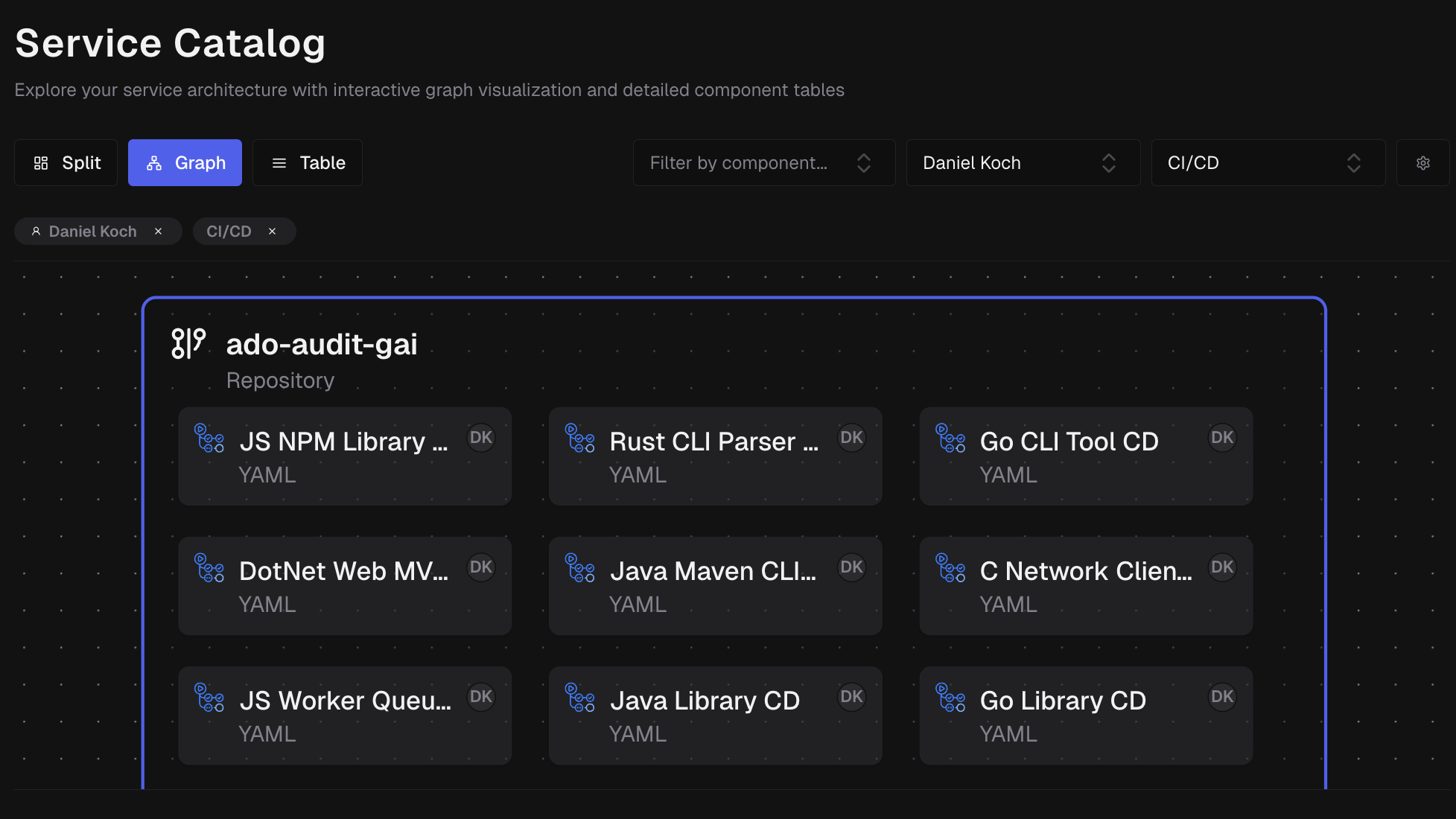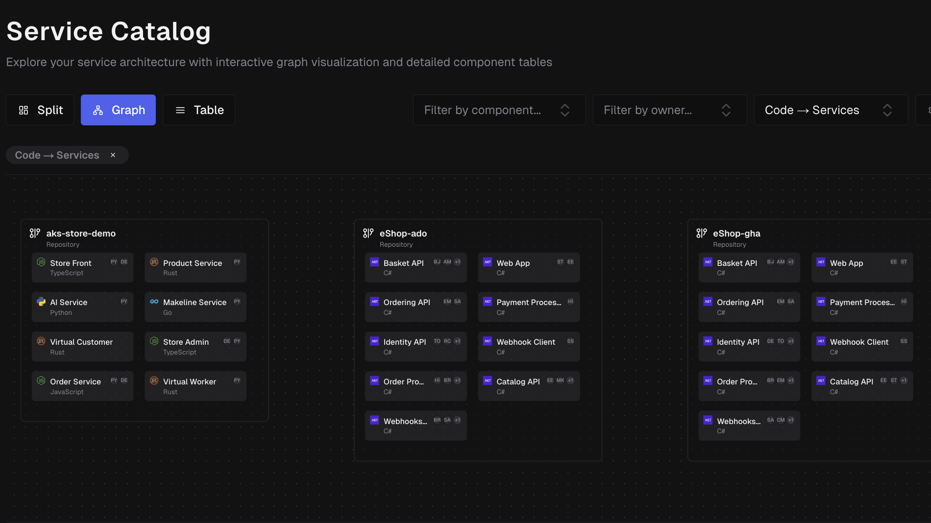 View your Service Catalog as an interactive graph or table with customizable filters to rapidly find what you're looking for.