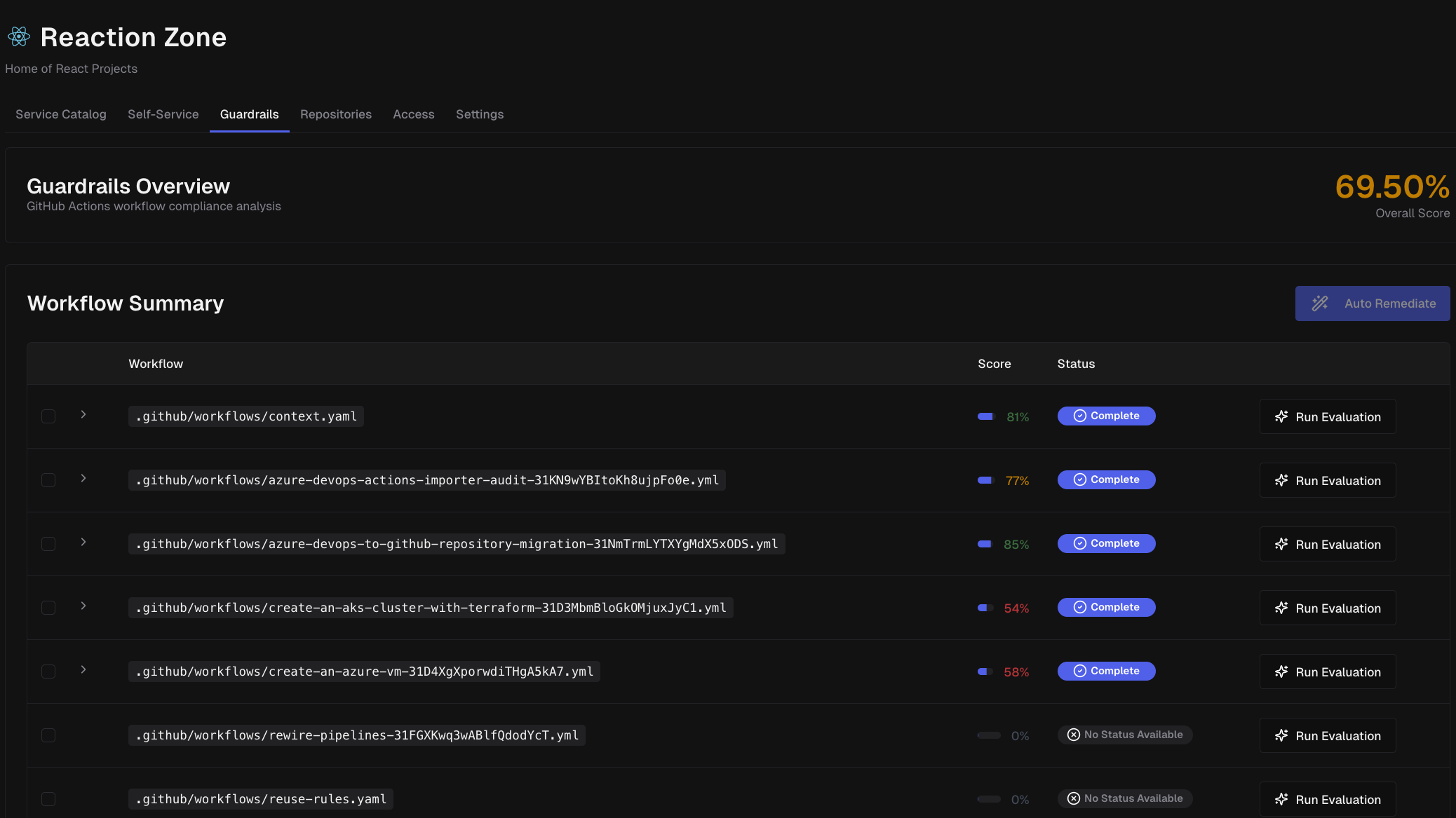 Automatically score the workflows that your software developers and platform engineers use everyday to ensure that reused code is secure and compliance with your organization's standards.