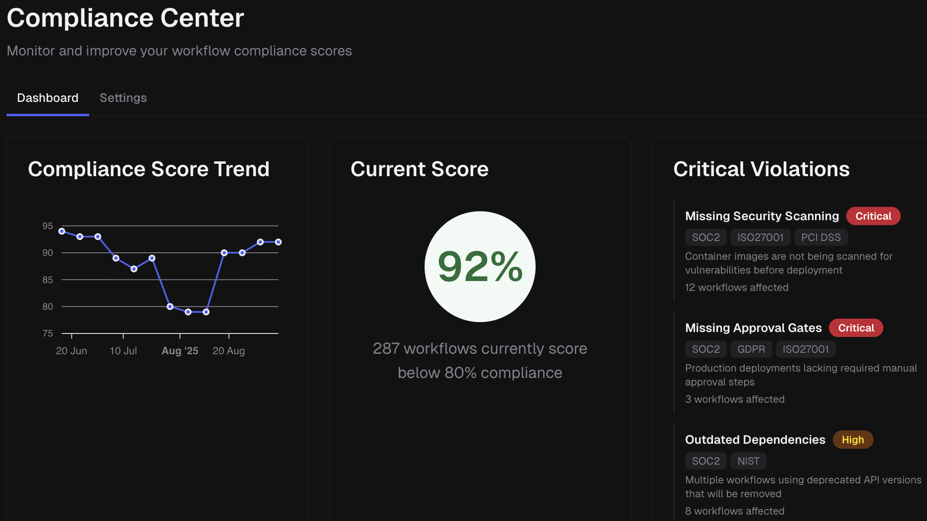 Organization dashboards provide a complete view of compliance across every workflow in the GitHub environment.