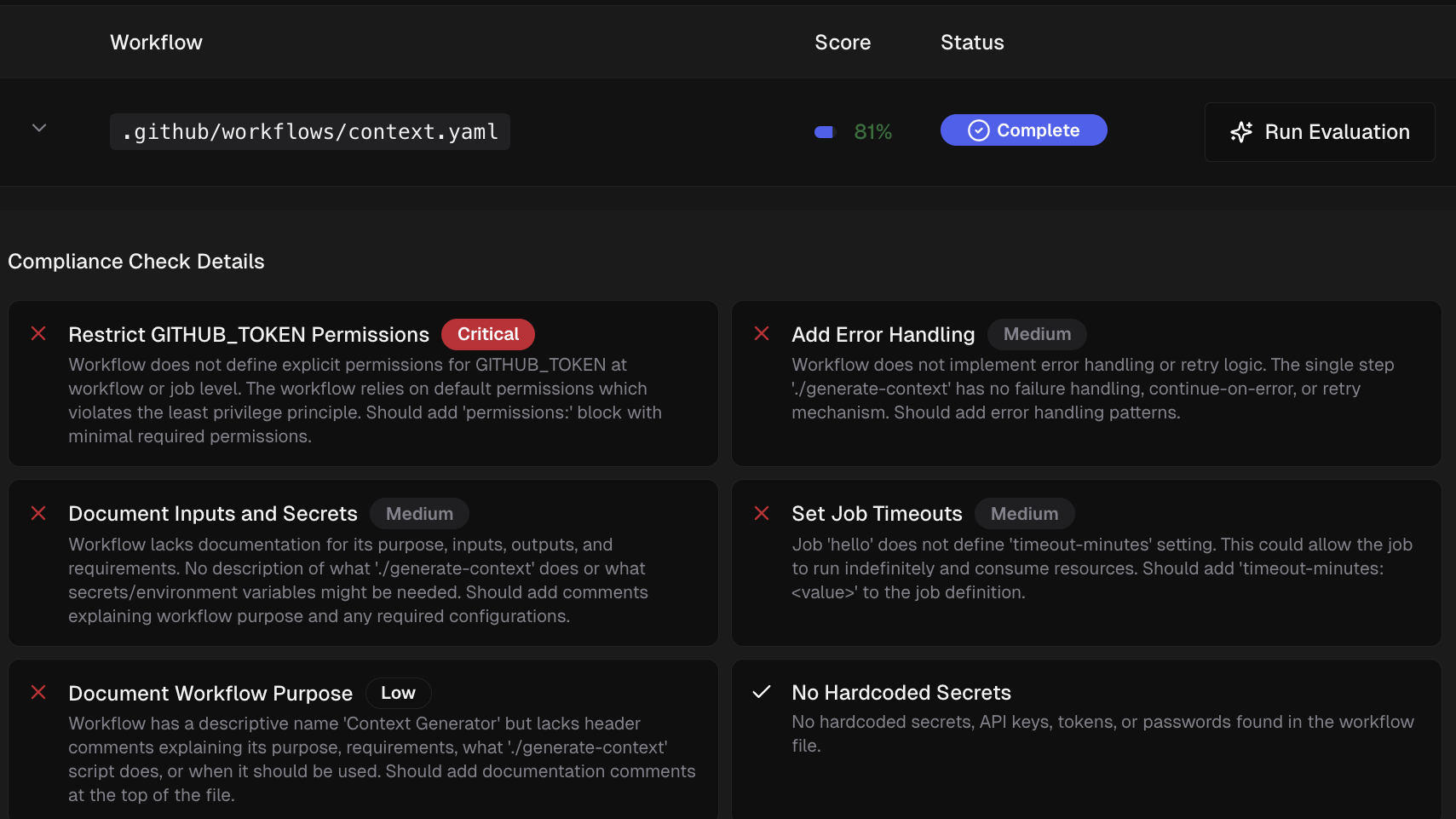 Define custom security and compliance rules for your organization, then let CodeCargo automatically evaluate every workflow, identify gaps, and provide instant remediations to maintain continuous compliance.