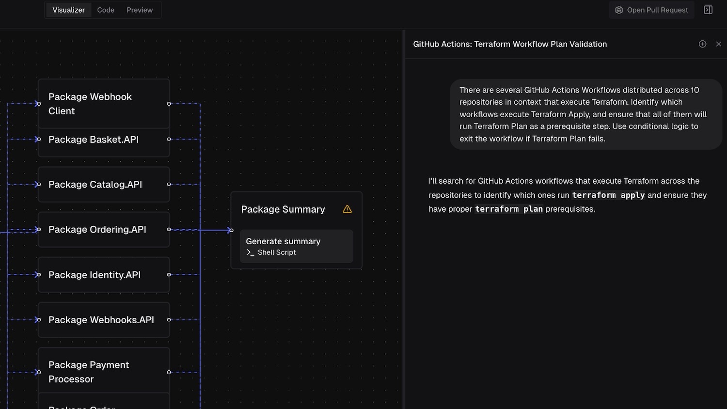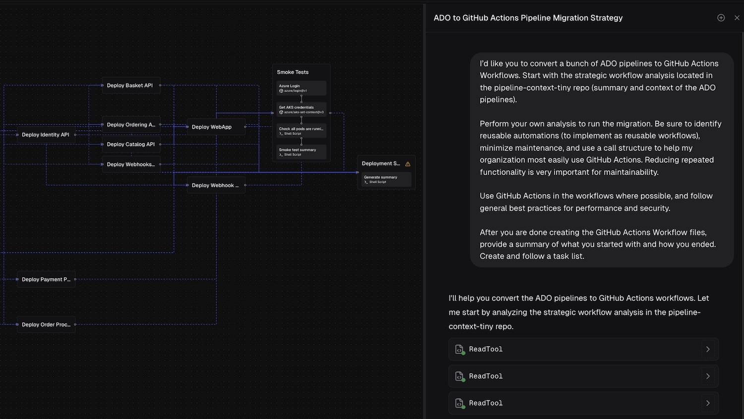 Use the multi-repo editor to migrate your entire CI/CD infrastructure to GitHub Actions at once. Convert hundreds of Jenkins jobs, Azure DevOps pipelines, or CircleCI configs simultaneously while maintaining your existing build logic.