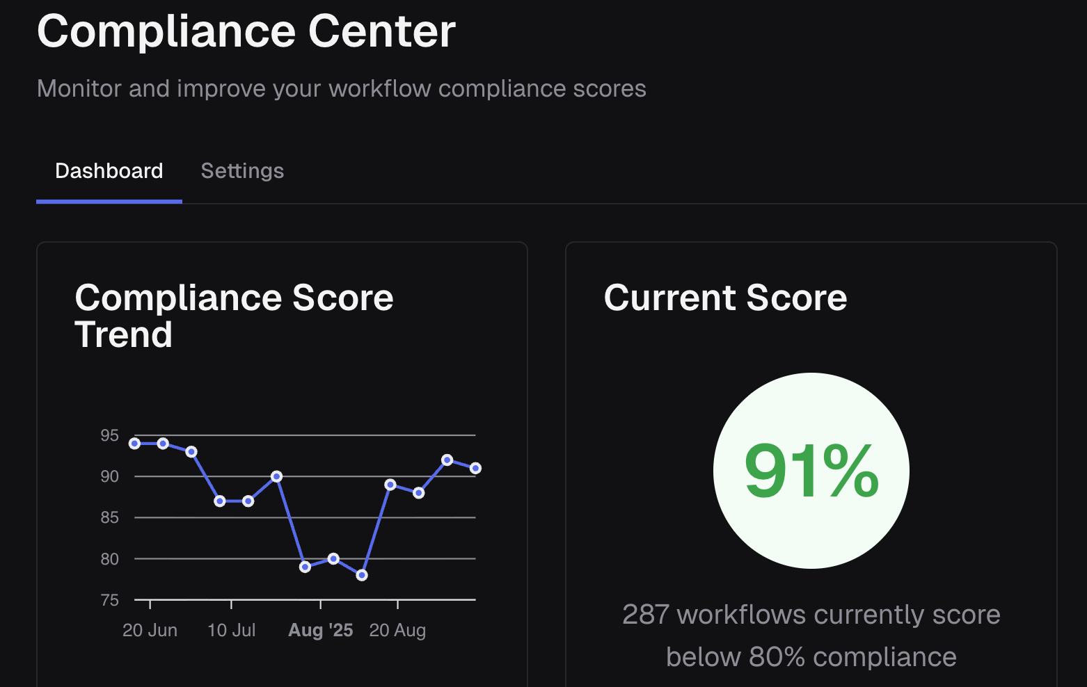 This dashboard gives developers the information they need to ensure their workflows remain compliant. Our platform helps the developer implement fixes to the workflows in two key ways: