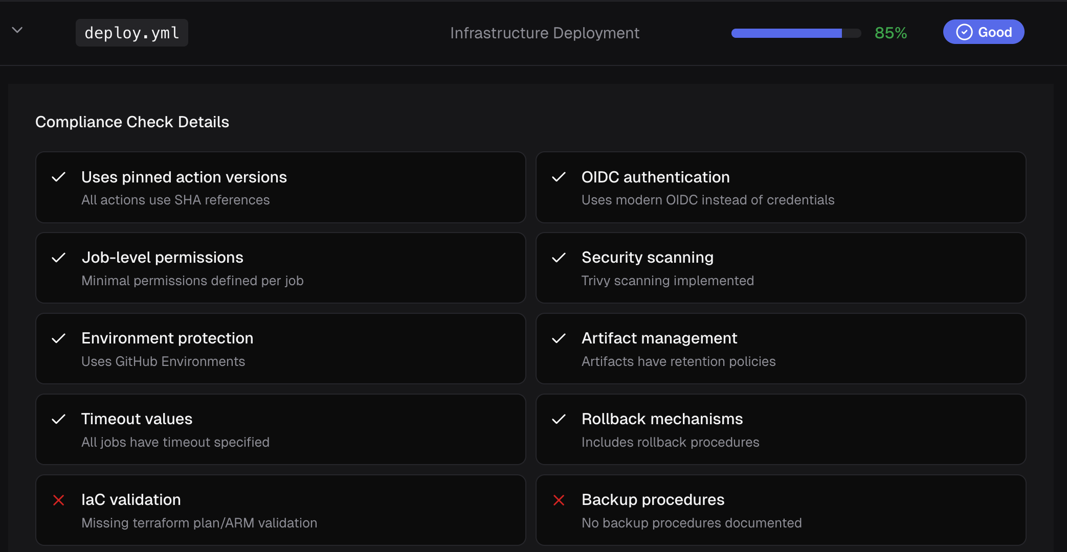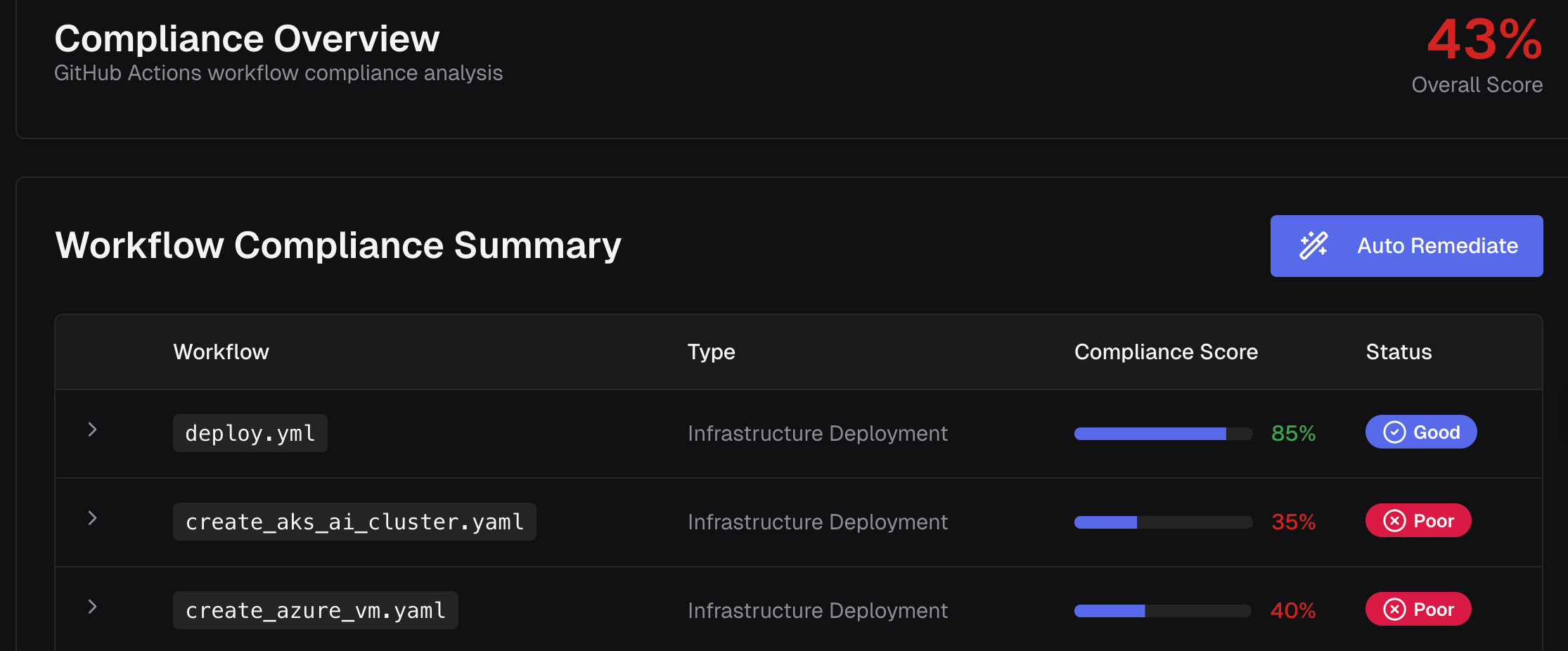 Pretty much every single GenAI inference provider can evaluate a single GitHub Workflow for generic best-practices compliance. However, enterprise organizations typically have hundreds, thousands, or even tens-of-thousands of workflows in their GitHub estate. Publishing corporate guidance that instructs individual SWEs to evaluate their workflows against compliance standards is not practical for modern organizations.