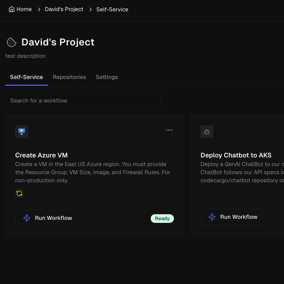 When you create a Project, you must include at least 1 Git repository. This will define where we "install" your Self-Service Workflow. This is useful if you want your workflow to reference particular code.