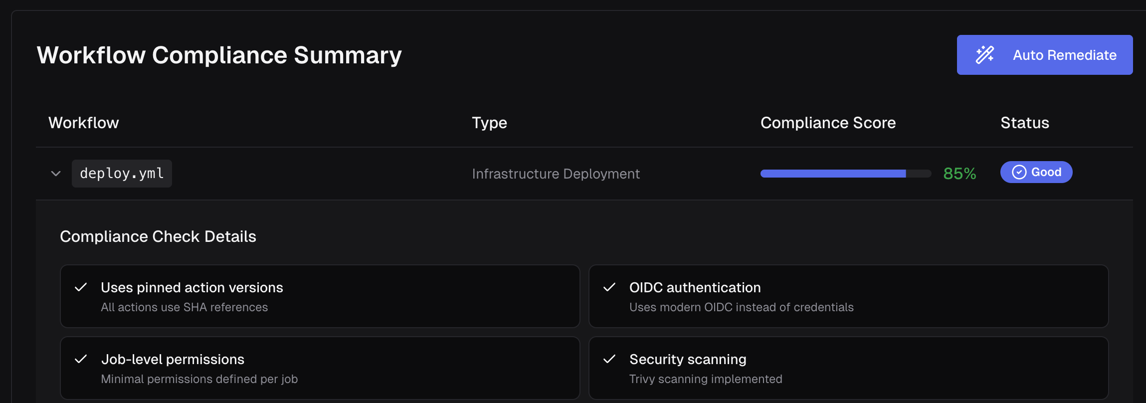 Traditionally, large enterprises have attempted to address this problem with centralized scanning platforms, policy-as-code frameworks like OPA, hardened runners, and SBOM mandates. While these are necessary steps, they are also time-consuming, expensive, and siloed. Security and platform teams spend countless hours stitching together tools, building dashboards in Splunk or Grafana, and chasing down non-compliant repos. The result is often a lagging view of compliance health rather than the real-time visibility leaders need. Exceptions pile up, evidence becomes fragmented, and executives are left with metrics that reflect yesterday’s state — not today’s risk.